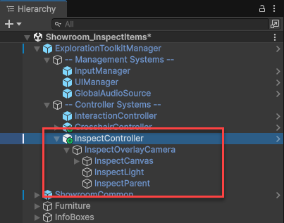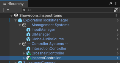 Add the InspectController prefab to your scene, located in the Core > Prefabs > Systems > Controllers folder, and make it a child of the ExplorationToolkitManager.