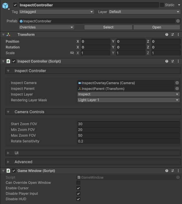 - InspectOverlayCamera - The camera which toggles when entering/exiting the inspect screen. This is an Overlay camera (so make sure to add it to your main camera's stack), which only renders the Inspect layer.