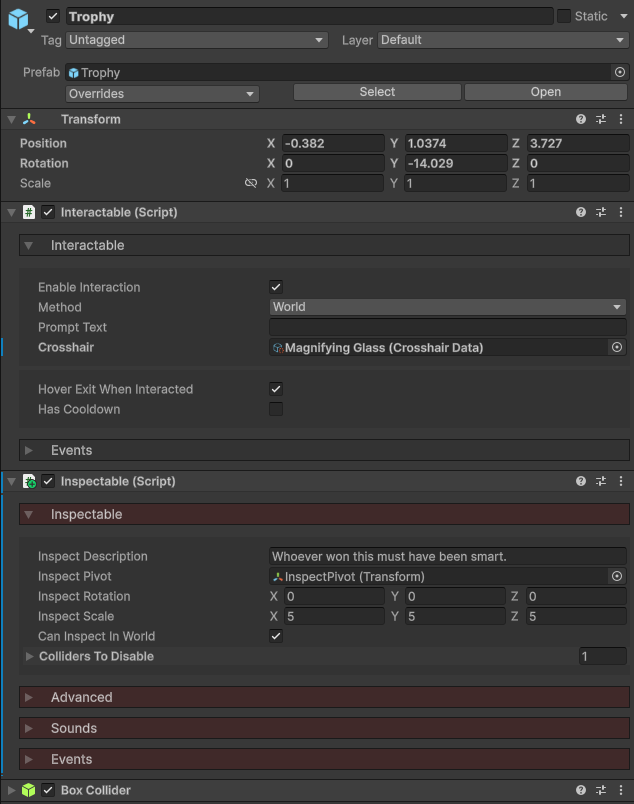 The Inspectable component marks a GameObject as available to be inspected by the player. For an object to be inspected, it requires 3 components: