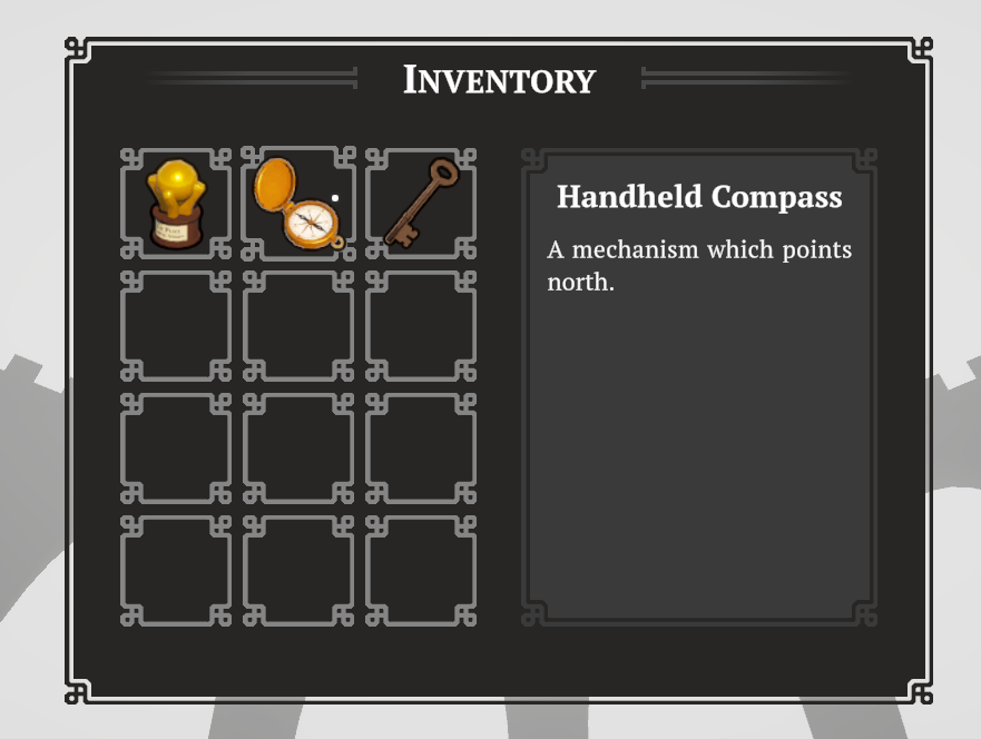 A window inventory displays items in a toggleable window (by default, the Tab button). You can hover over these items to display their name and description on the right hand side, and if setup, even inspect them.