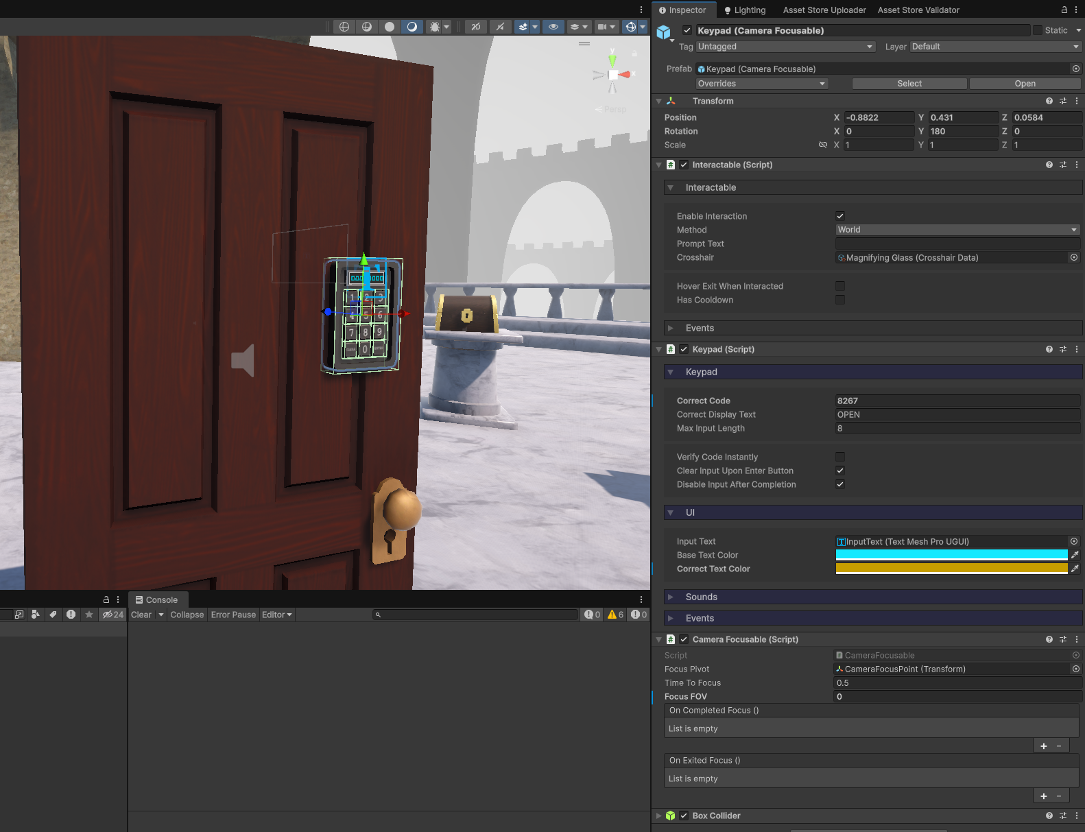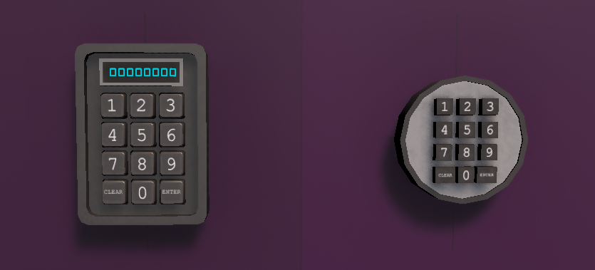 Keypads are interactables which allow the player to input a numerical code via buttons. These can be useful for locked doors, safes, or any other kind of puzzle.
