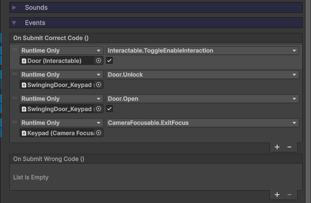 OnSubmitCorrectCodeevent, connect these functions:Interactable.ToggleEnableInteraction(true)- Allow the player to now interact with the door.Door.Unlock()- Unlocks the door.Door.Open(true)- Opens the door (you might not want the door to open automically upon unlock too).CameraFocusable.ExitFocus()- Stop focusing on the keypad (if using the camera focusable version).