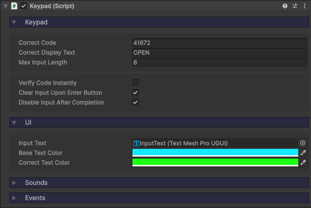 Clear Input Upon Enter Buttonis true and the player clicks ENTER, the current input will be cleared. Disable Input After Completionwill disable the keypad once the correct code has been entered.Base Text Coloris the color of the display text by default.- When the correct code has been entered, the text color will change to