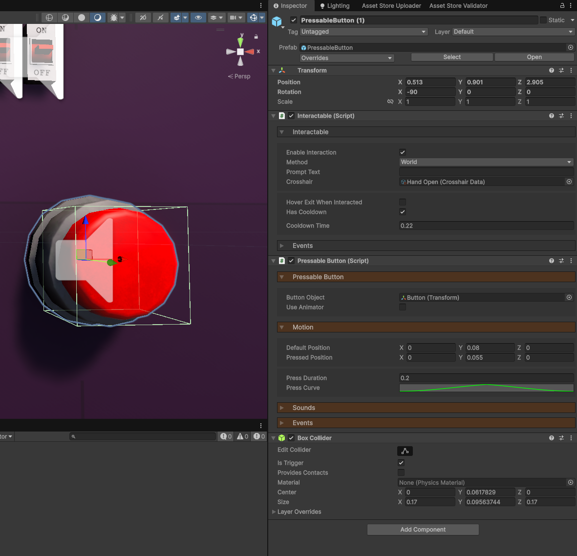 - Interactable - Used to detect when the player is looking at the button.