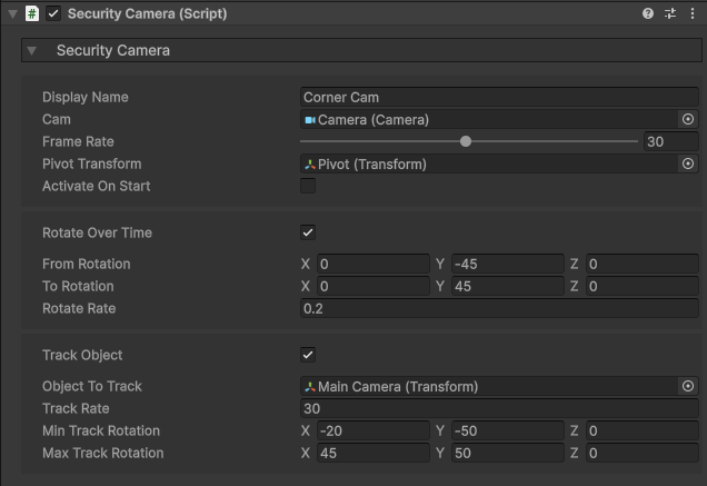 Display Name- The name of the camera when viewed on a computer.Activate on Start- Begin rendering the camera when initialized (not recommended for performance reasons).Frame Rate- The rate at which an image will be rendered. Lower for better performance and realistic simulation of security cameras.Do Rotate Over Time- Pan the camera back and forth. You can define the from and to rotation, as well as the speed.Do Track Object- When the specified object is within the min and max track rotation, the camera will rotate to face them.