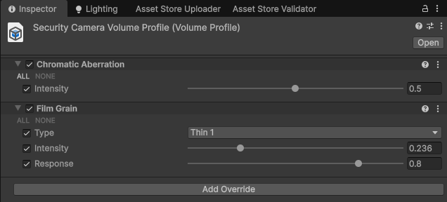 Security cameras are generally low-quality, grainy, off-colored, and we can simulate this in Unity using post-processing effects. By default, the security camera prefab features a Sphere Volume, which is a small, local volume for the camera.