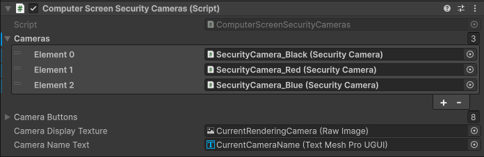 - In the ComputerScreenSecurityCameras component, add the cameras you wish to view on the computer to the