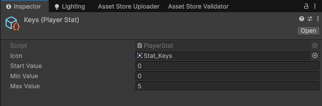 A stat is represented via a ScriptableObject. To create one, right click in the Project window and go Create > Exploration Toolkit > Player Stat. Give the file a name, then you can fill in the properties.
