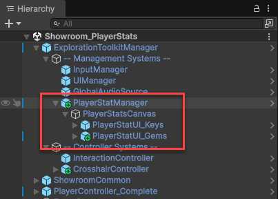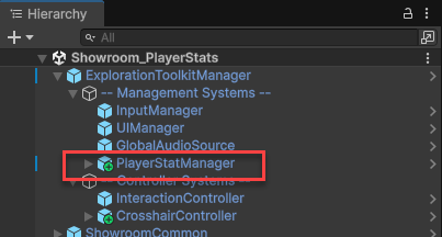 If you wish to use player stats in your scene, drag in the PlayerStatManager prefab, located in the Core > Prefabs > Systems > Management folder into your scene as a child of the ExplorationToolkitManager.