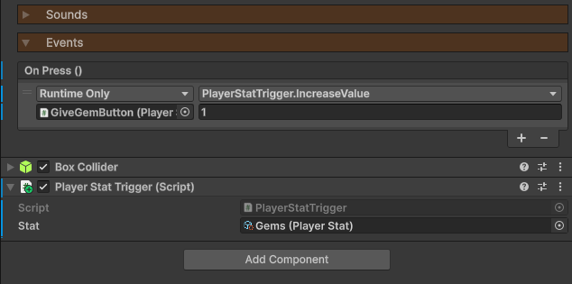 In the example below, I have a PressableButton which increases the Gem stat by 1 each time it's pressed.