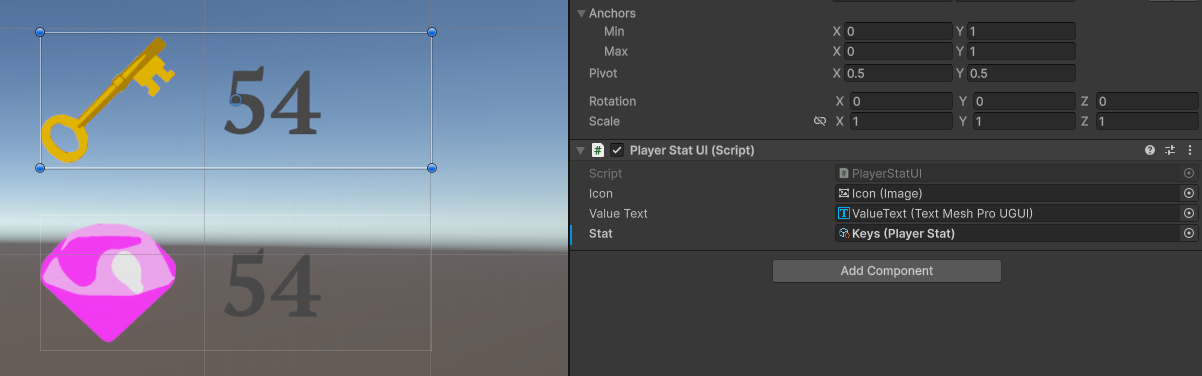 For each PlayerStatUI, position it in the canvas, and assign a stat to the Stat property. At the start of the game, this component will automatically connect to the PlayerStatManager and display the current value of the stat. Whenever the value changes, so too will the text.