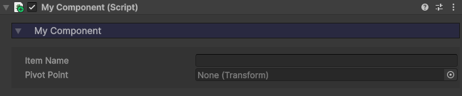 DrawPropertyfunction, with the property name as the parameter. Optionally, you can send a second string parameter to override the name displayed.if(mainFoldout) { DrawProperty("itemName"); DrawProperty("pivot", "Pivot Point"); }