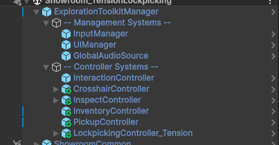 For all the management and controller systems you wish to implement, make their GameObjects a child of the ExplorationToolkitManager, as this is how they will be identified and automatically registered upon initialization.