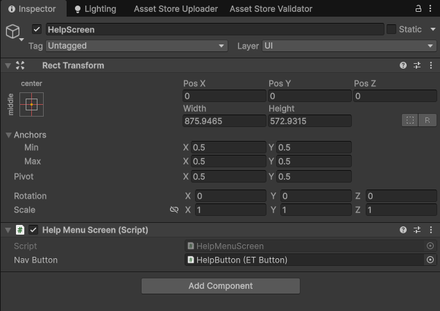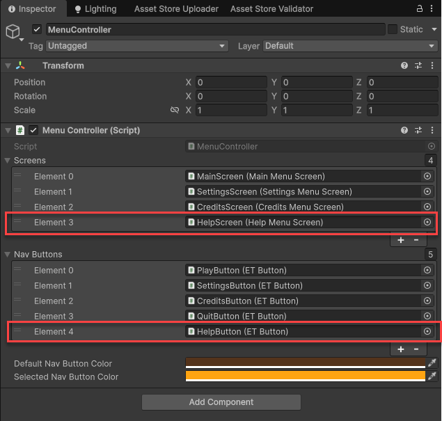 Finally, select the MenuController and add both the screen and nav button to their respective lists. Screen 0 is what gets set at the start of the game.