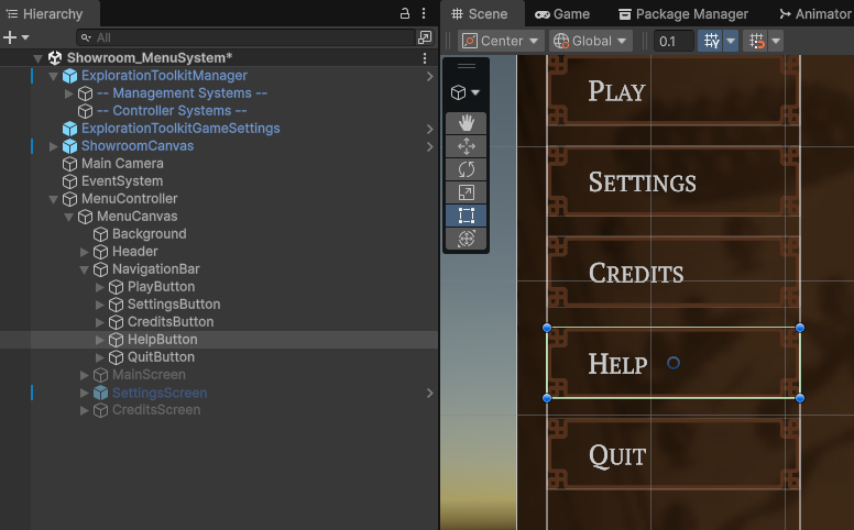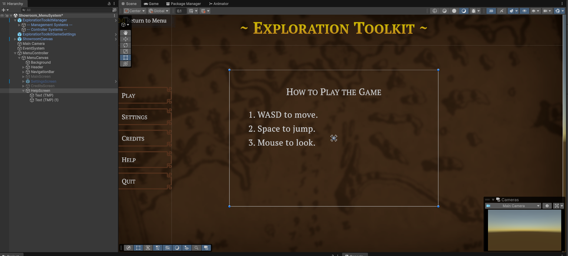 ExplorationToolkit.Menunamespace, and inherit fromBaseMenuScreen.namespace ExplorationToolkit.Menu { public class HelpMenuScreen : BaseMenuScreen { // Add any initialization code to the OnEnable() function. } } -