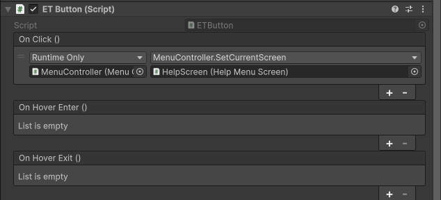 OnClickevent, connect that to the MenuController'sSetCurrentScreen()function, sending over your new window component.