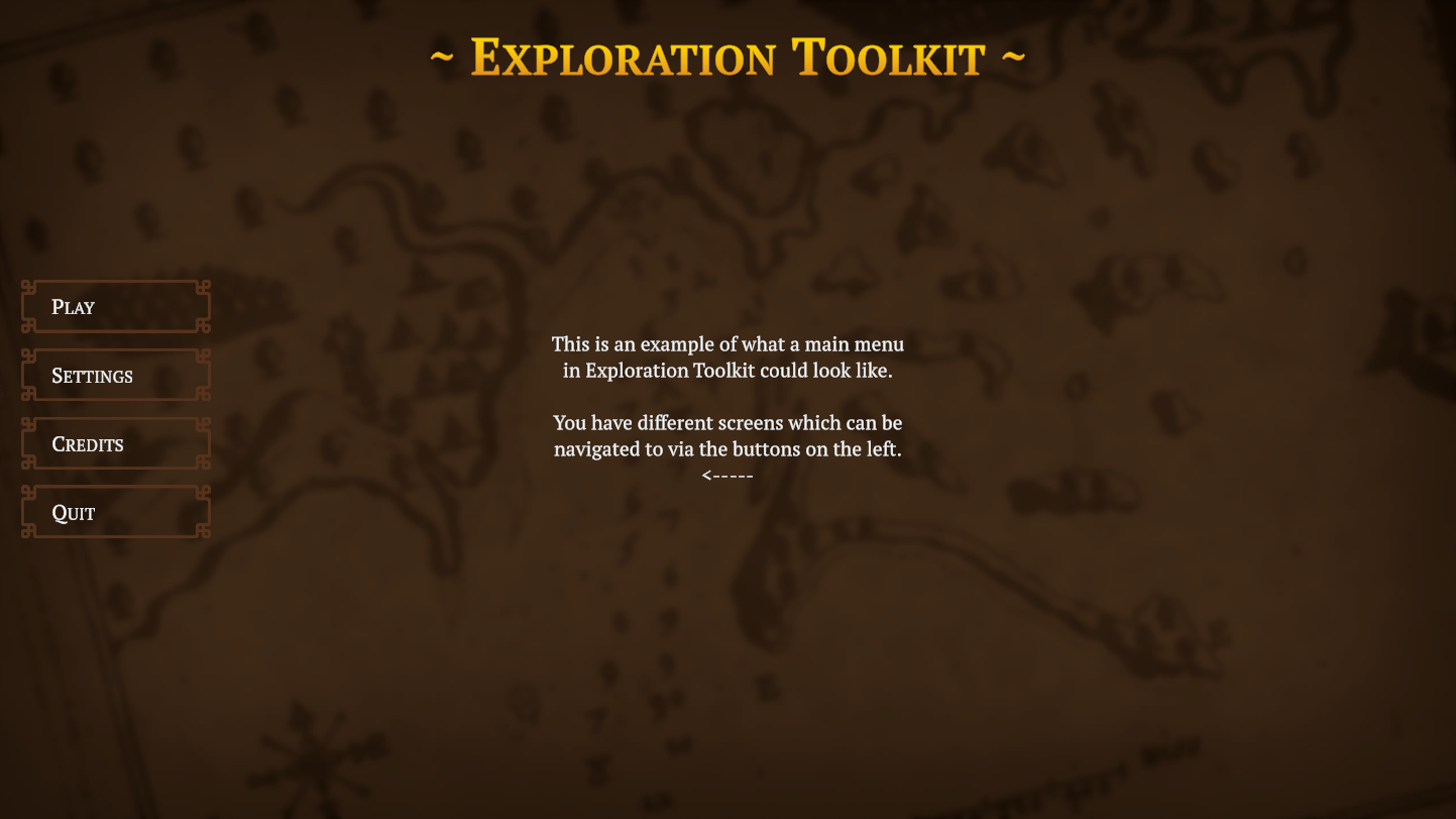 The toolkit features a complete menu system ready to be used in-game. The highlight of the menu is the settings screen, which allows the player to adjust their graphics, audio, and control settings.